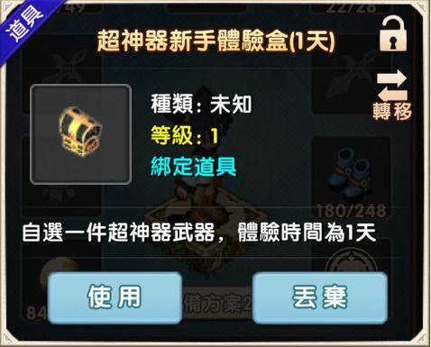新創帳號的每個角色都會有「超神器新手體驗盒(1天)」。