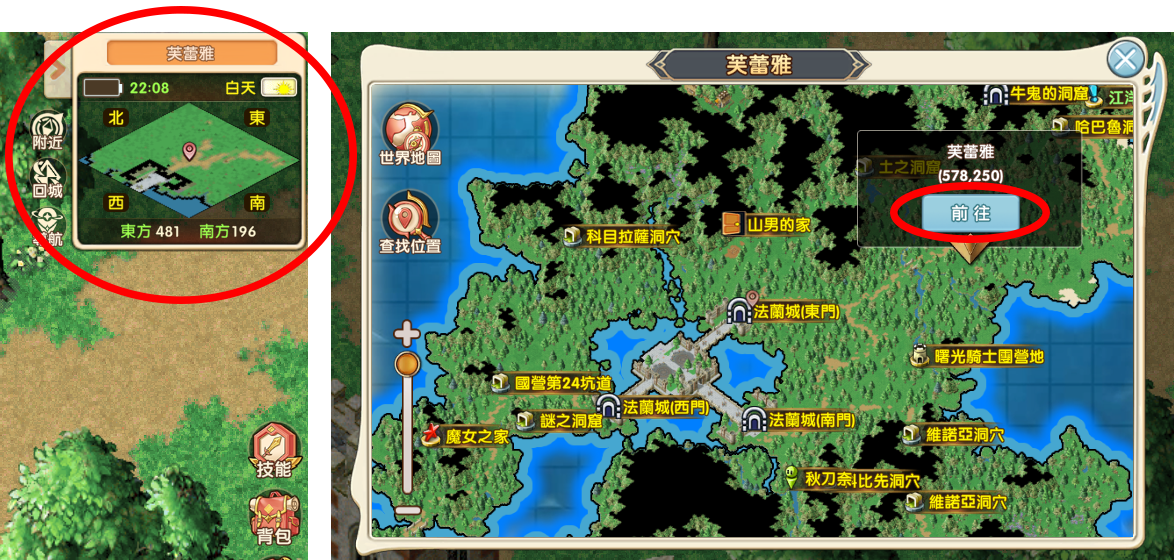 在主畫面中點擊右上角"地圖"即可打開"世界地圖功能”,玩家可以畫面上查看想要去的地方,及可以任意地方點擊“前往",系統便會執行自動走路功能