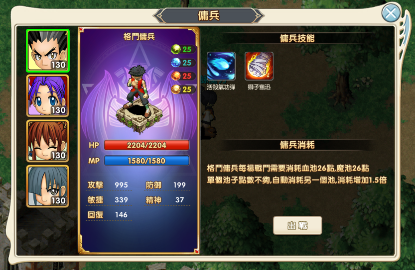 傭兵每場戰鬥後自動滿血魔,但在戰鬥中死亡後不能被救回 傭兵每次出戰會消耗角色血魔池,消耗量按照等級及傭兵類型計算