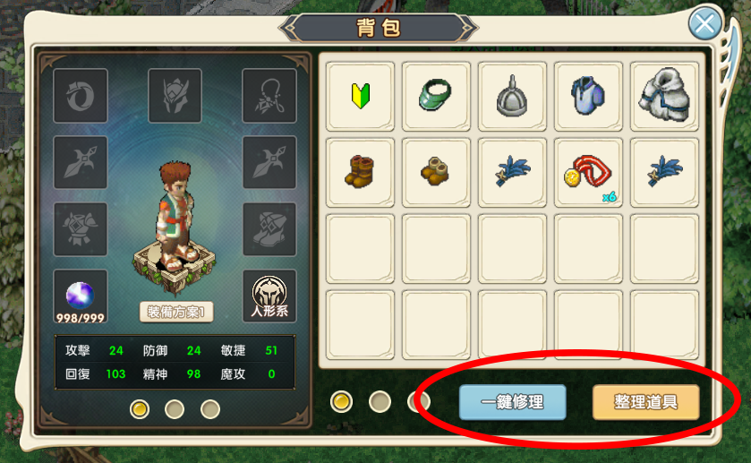 在背包的畫面,提供一鍵修理裝備功能(需消耗魔幣)及整理道具功能(按道具的種類重新排序)