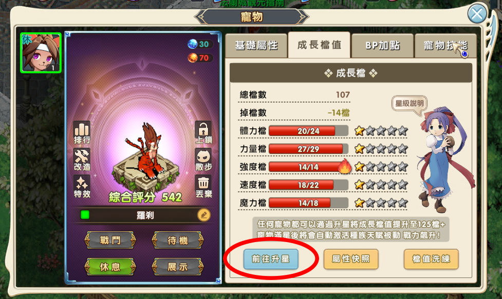 寵物升星 - 所有寵物均可透過升星系統提升檔次(1粒星代表1檔),每只寵物上限25粒星(每項能力上限5粒)