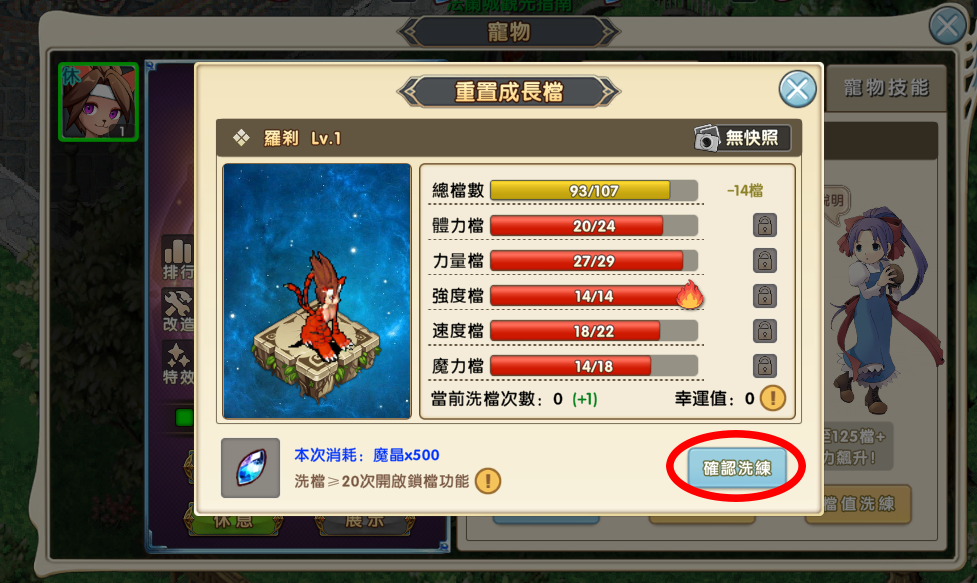 檔值洗練 - 所有寵物均可使用魔晶重置檔次,按洗練的次數會解鎖"鎖檔"功能