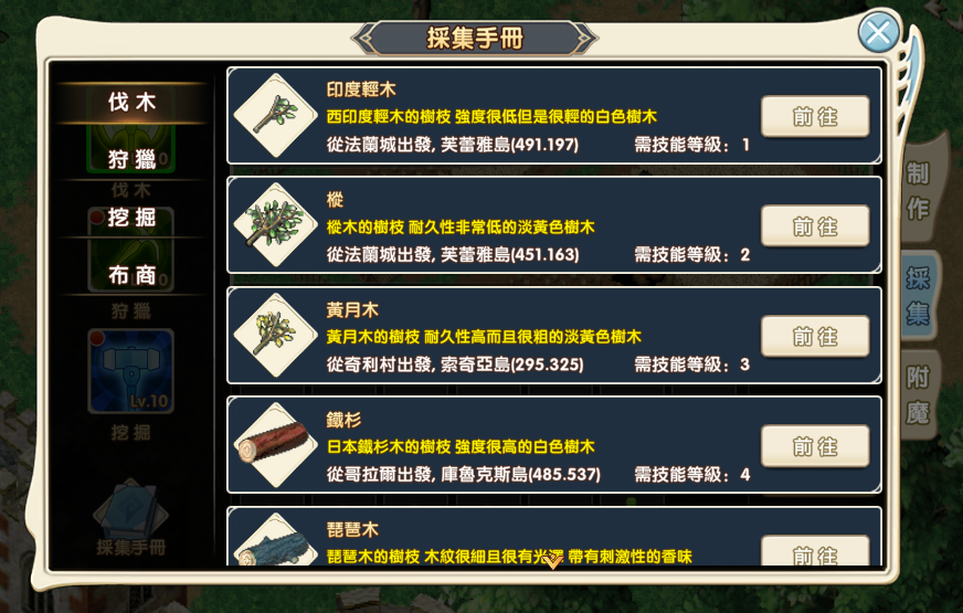 採集手冊 - 提供所有採集材料的位置資料及自動行走功能