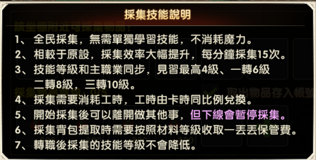 補充第5點 - 玩家到採集點後點擊“開始採集”後系統會進行採集結算,此時無論角色移動至別的地圖或進入戰鬥,都不會影響採集工作,除非按了“停止採集”