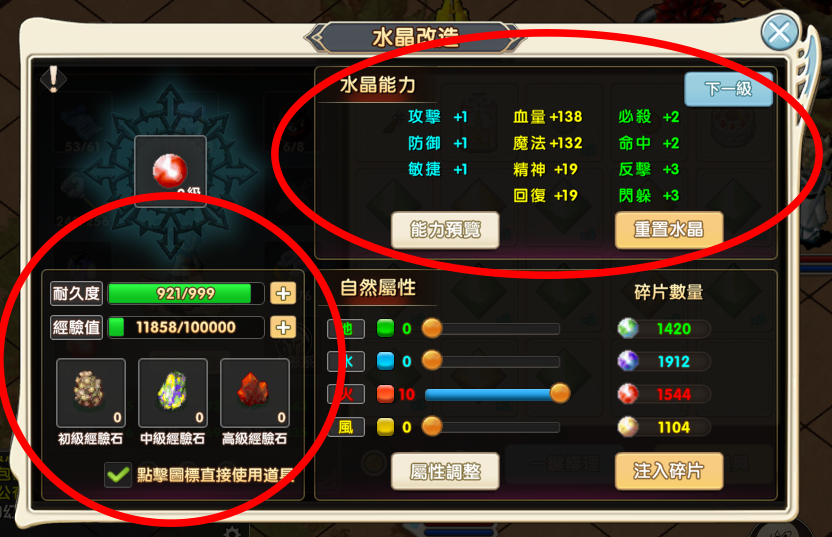 水晶改造 - 點擊背包中的水晶可以進入水晶改造界面,便可以對水晶進行: 提升水晶等級,獲得隨機額外能力值加乘[每級疊加] 提升水晶等級的方法: