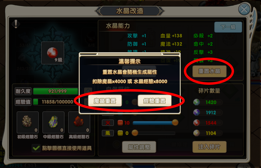 - 重置的水晶等級愈高,魔晶/水晶經驗需求愈高