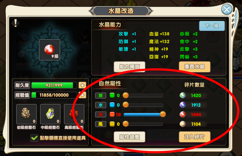 - 玩家可以預先"注入水晶碎片",然後按照需要對水晶屬性進行"調整"。
