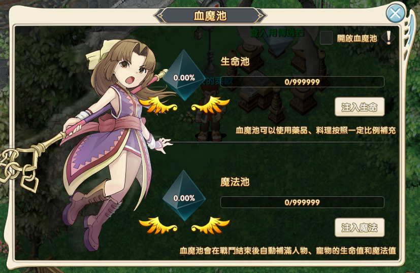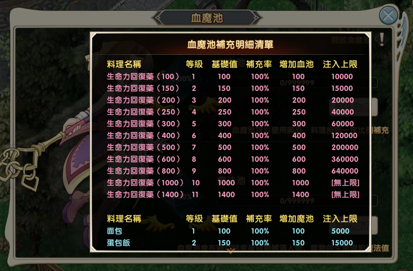 **血魔池系統** - 玩家可以預先把藥水或料理注入至血魔池中(道具等級越高,增加值會越高), 且在當戰鬥結束時,依照玩家自己的設定,自動補充角色及寵物的生命值和魔法值 生活及製造系統