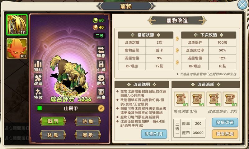 寵物等級到頂後,可透過寵物改造進一步增加 BP、提升能力。改造圖紙需要挑戰 魔物幻境 取得。