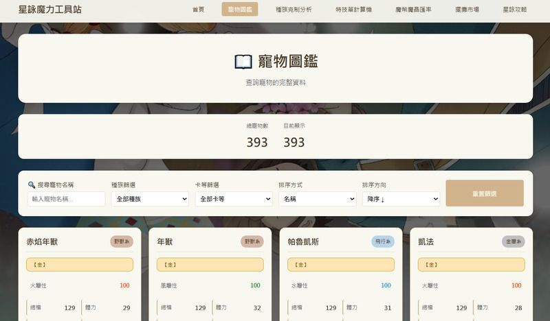 | 寵物圖鑑 | 方便各位查看與對比所有寵物的能力數值。 |