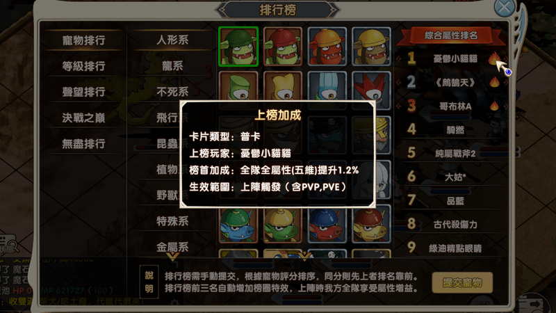 排行榜前三名的寵物上陣時,全隊全屬性(五圍)將得到百分比加成!此加成在 PVP 及 PVE 均生效,且多隻上榜寵物可疊加。