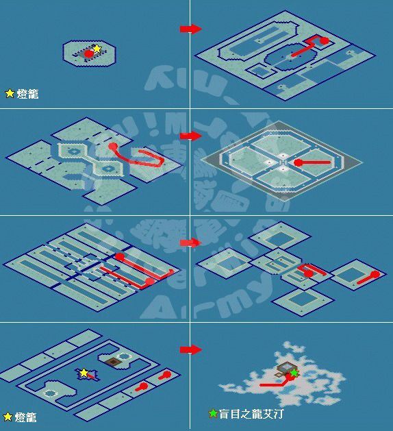 8. 調查燈籠 (50, 48) 到達深海最底層的海之神殿,與盲目之龍艾汀 (53, 24) 說話選「是」進入戰鬥。 戰勝後傳送至深海第七層調查龍之沙漏選是傳送回歌姬處