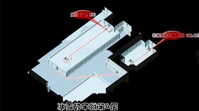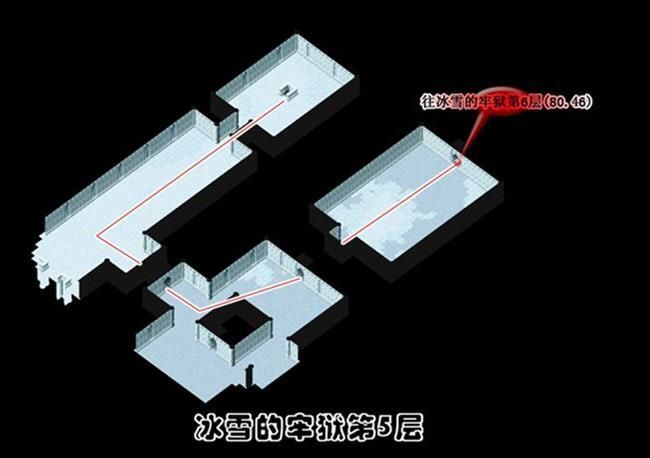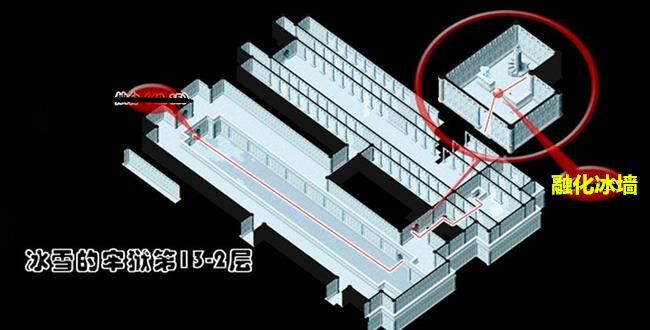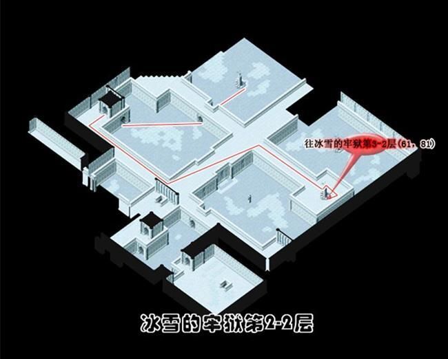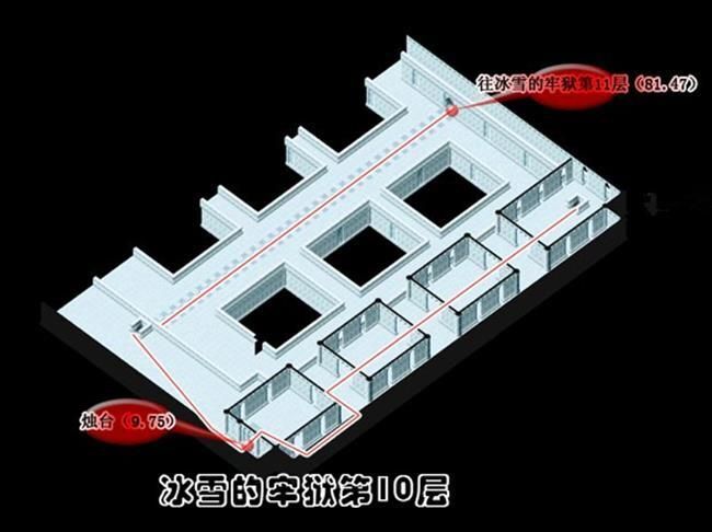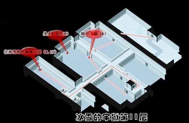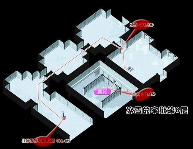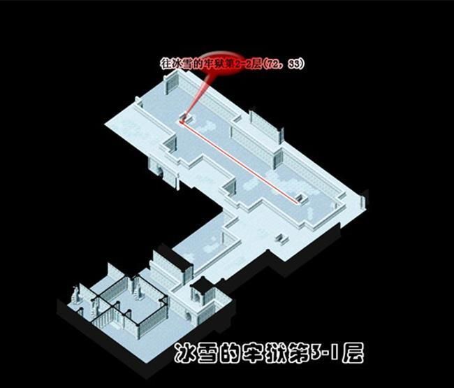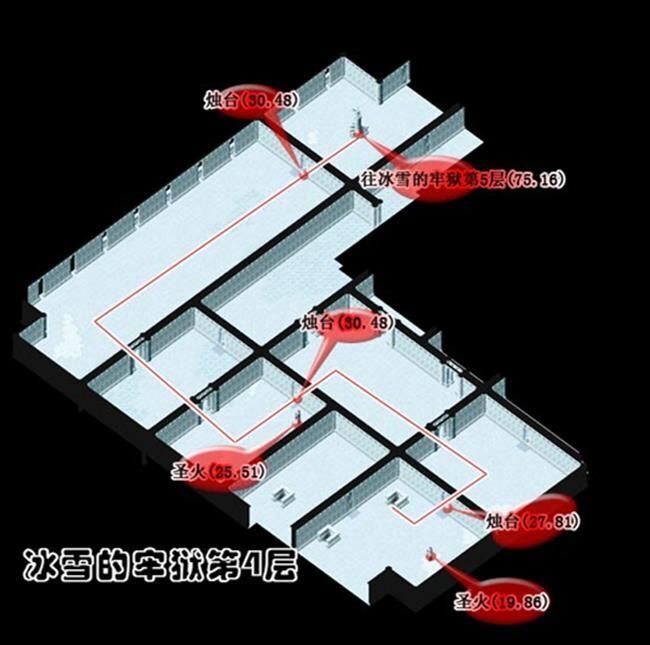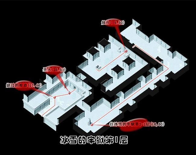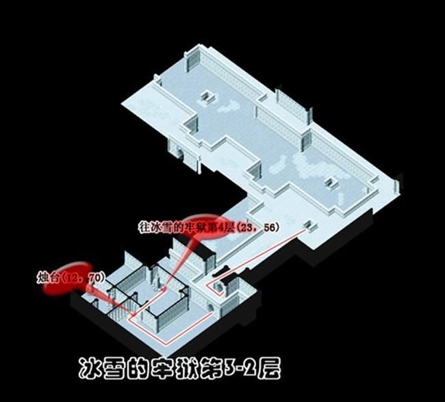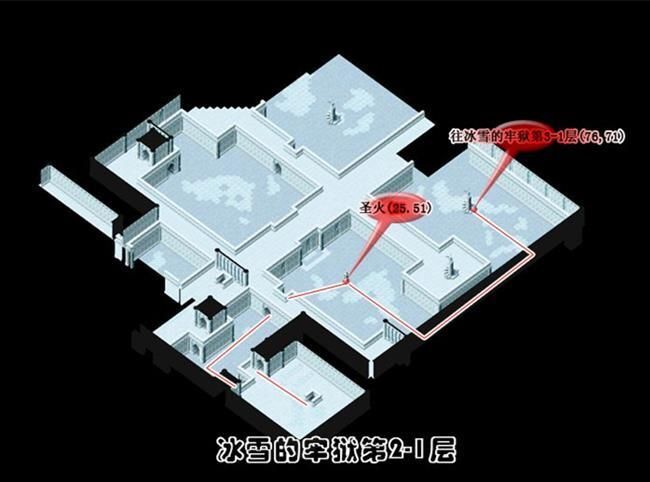 - 從(174,103)進入冰雪的牢城到冰雪的牢城(17,46)調查被火燃燒過的痕跡A拿取火把到(25,51)調查聖火B得到蒼炎的火把再到(75,50)調查燭台C出現上樓的樓梯到2樓火把經聖火點燃後會變成蒼炎的火把蒼炎的火把用途為融化障礙物使用一次後變回火把最好全隊都拿可以省去找燭台的麻煩可用自動導航但最好每一次融化障礙物就更換持有蒼炎的火把的人為隊長省去每次將火把點燃成蒼炎的火把的路程