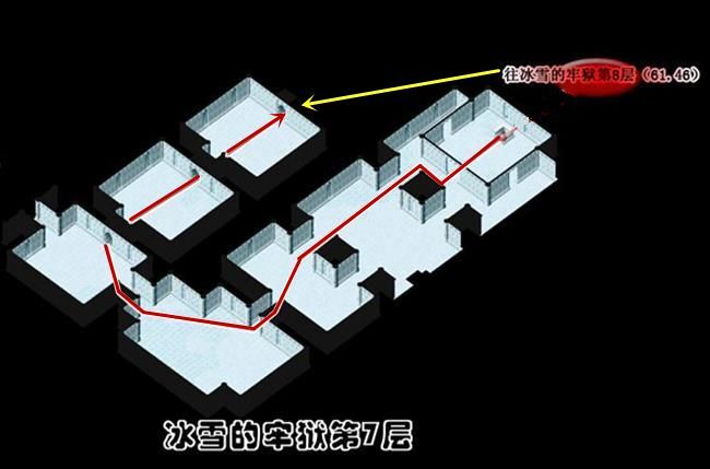 獲勝後隨機獲得暴食的罪書與露比說話取得冰之約束 露比戰鬥訊息見下方戰鬥資訊此處可回城補給休息雙擊冰之約束可傳送回冰雪的牢城8樓戰勝露比後場景地圖 - 通過後到(46,47)調查聖火到(74,31)調查燭台M通過後從樓梯(14,46)進入9樓