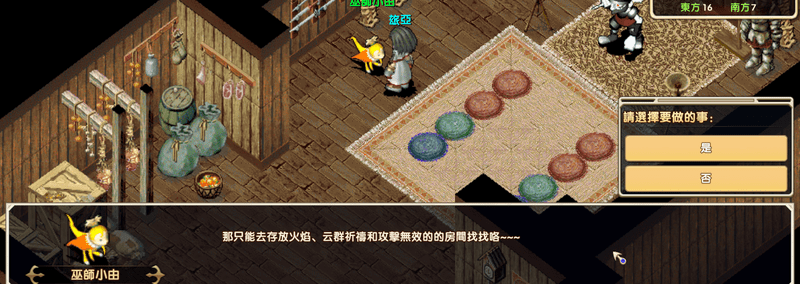 | 選是幫忙 再按確定 | 選是進入房間一 魔法無效、大地的祈禱、海洋的祈禱 | 選否再選是進房間二 攻擊無效、火焰的祈禱、雲群的祈禱 |