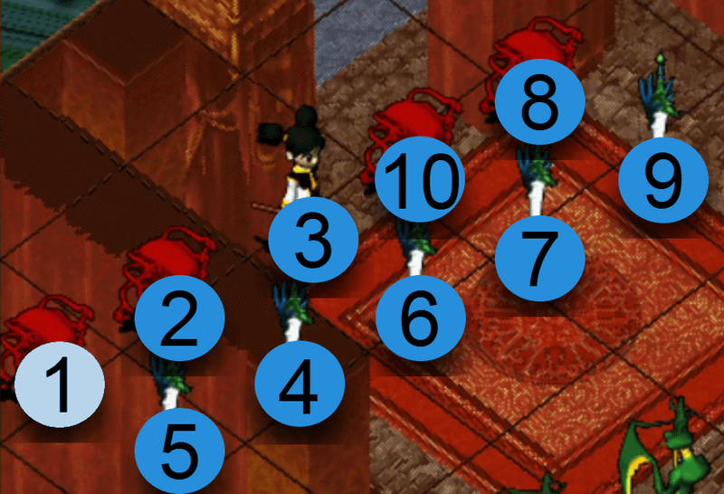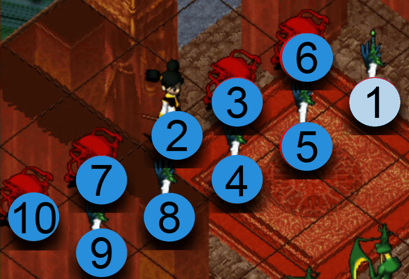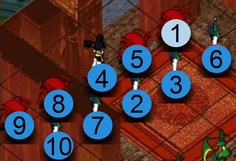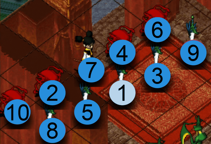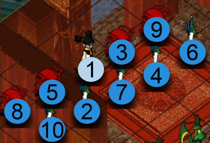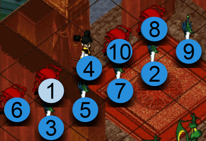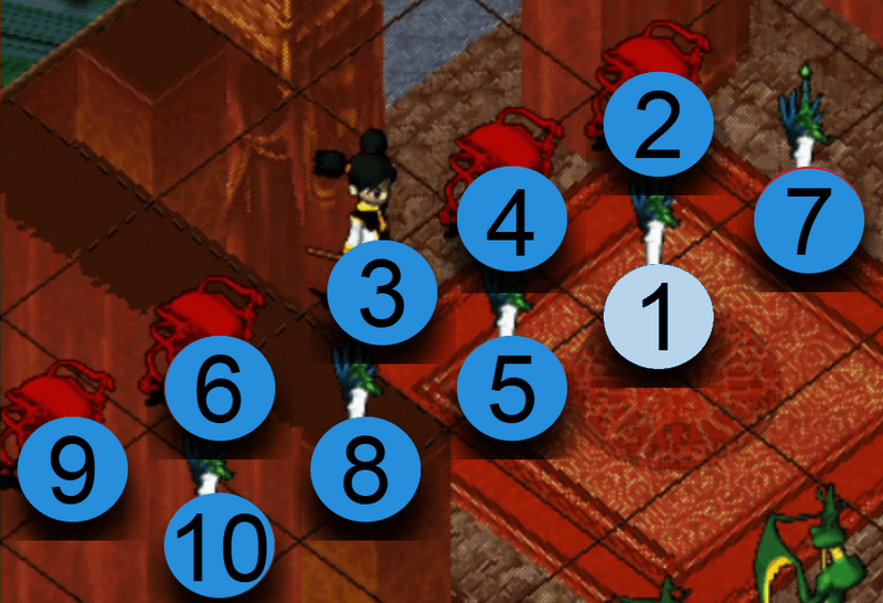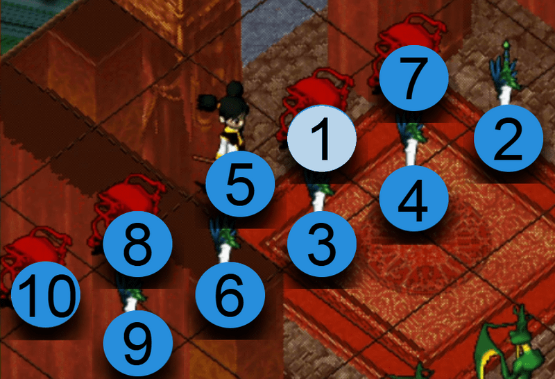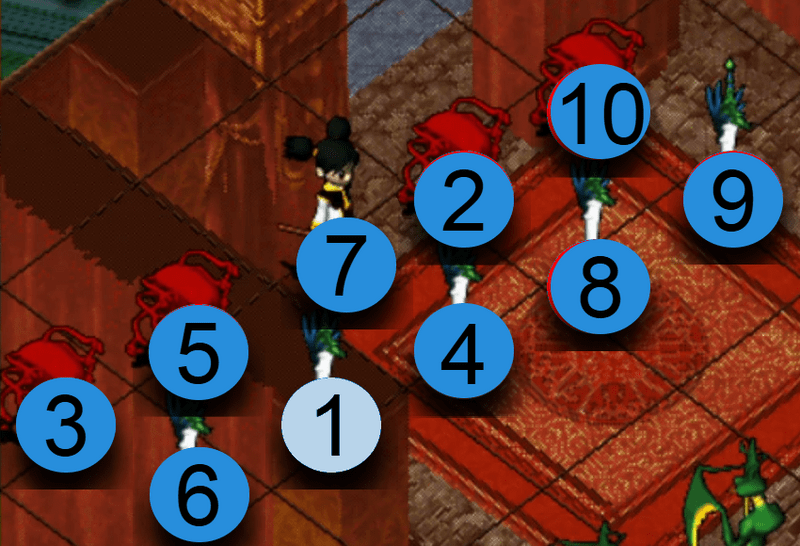 選擇攻擊對象後,氣功彈會依照以下的順序散佈攻擊。如優先攻擊位置沒有敵人,便會自動往下個順序位置攻擊。